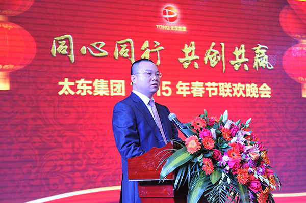 本次晚会在富有激情、欢快、向上的氛围中进行。首先,由太东集团董事长、总裁苏志团先生上台向大家致辞。苏董为大家送上新春美好祝愿的同时,总结性地回顾了2014年太东集团的发展,并提出了太东2015年的战略及部署:强调战略布局,集团将集中优势资源,重点打造“1+2+3”业务发展模式;强调管理为经营服务,推进团队建设和管理流程、制度改革;弘扬公开、公正、透明、规范的太东文化,凝聚众人力量,实现共同梦想。苏董的讲话热情洋溢,令人振奋。