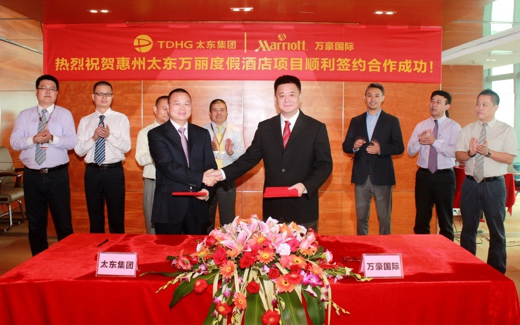 2013年8月30日,惠州市太东万丽度假酒店项目签约仪式在惠州市如期举行。在简朴庄重的气氛中,太东集团董事长、总裁苏志团先生与万豪国际高级副总裁林聪先生分别代表双方正式签订了管理合约。