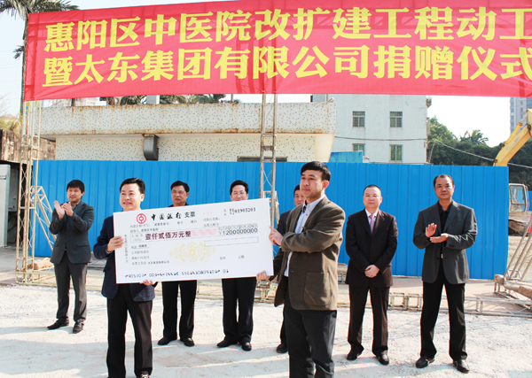 2013年3月6日上午,惠阳中医院改扩建工程正式动工。惠阳区领导刘小军、黄秋福、张传友、魏荣君、刘毅峰及太东集团董事长苏志团、太东地产板块总经理曾睿等出席了仪式。