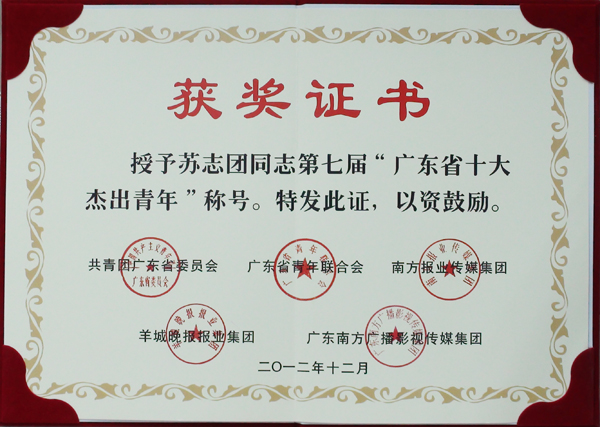 热烈祝贺太东集团董事长苏志团荣膺第七届广东省十大杰出青年