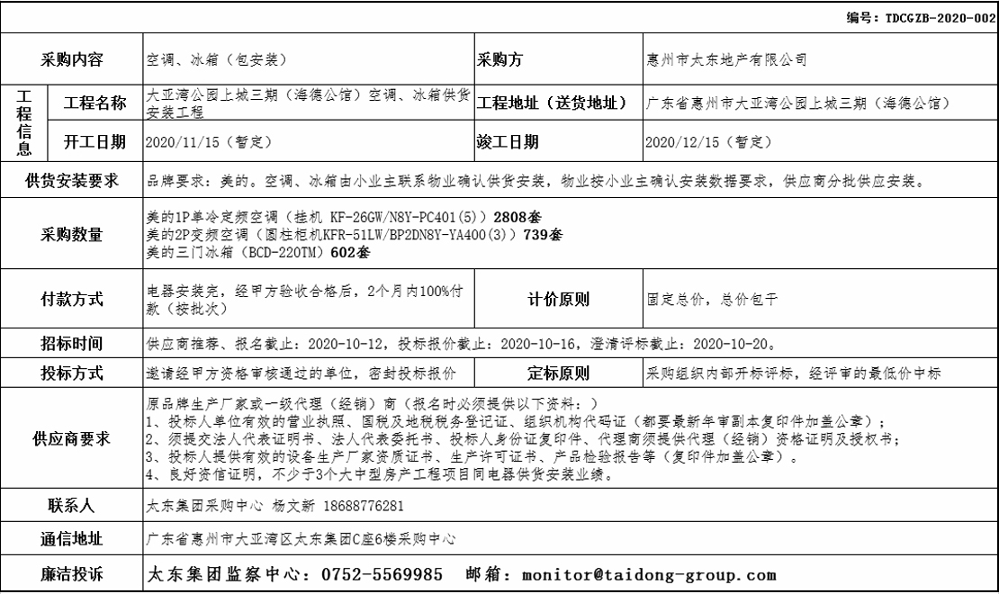 大亚湾海德公馆项目3547台空调、602台冰箱采购招标公告