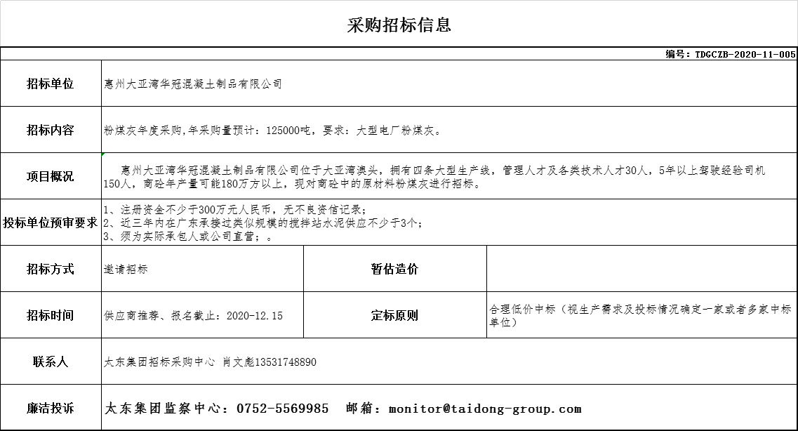 华冠搅拌站粉煤灰材料年度采购招标公告