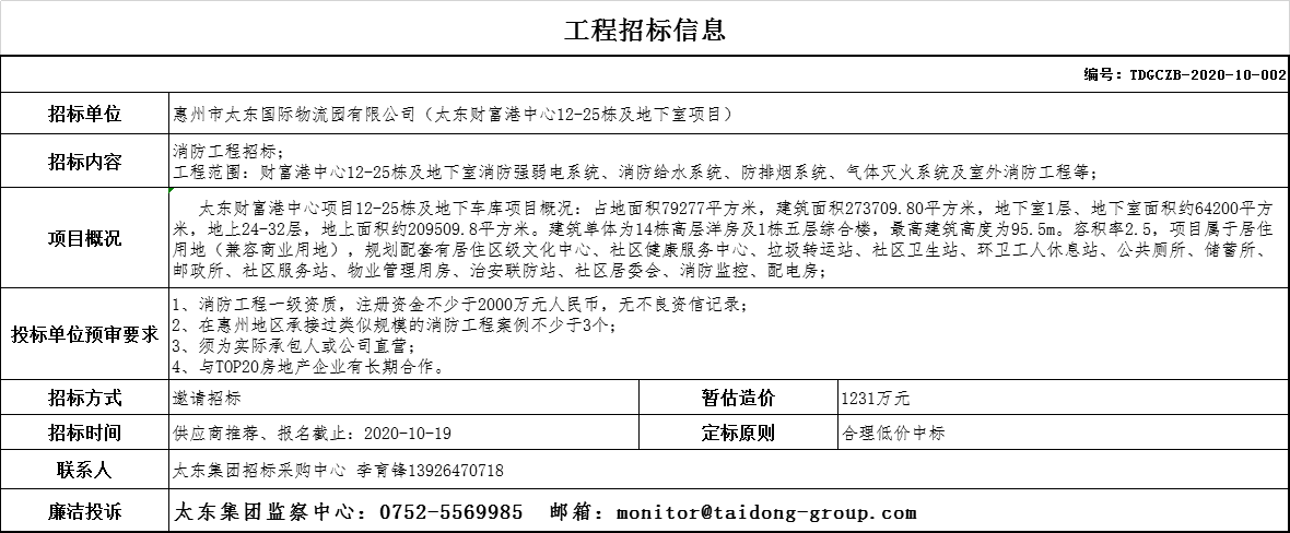 太东财富港中心(12-25栋及地下室)项目消防工程招标公告
