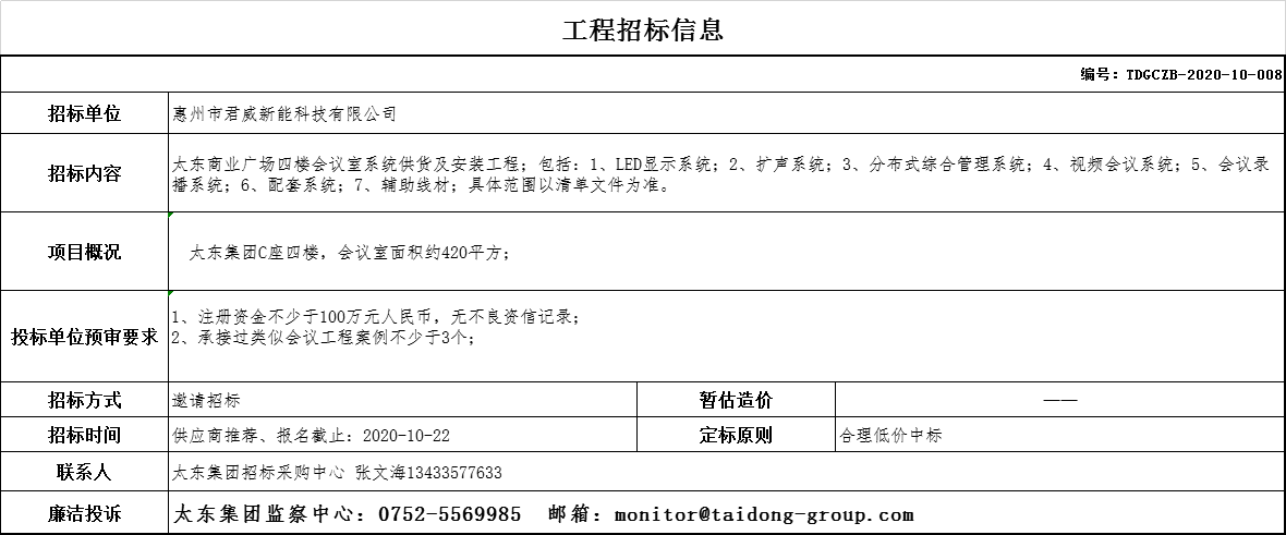 太东商业广场四楼会议系统供货及安装工程招标公告