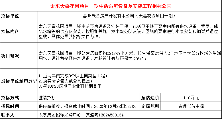 太东天熹花园项目一期生活泵房设备及安装工程招标公告