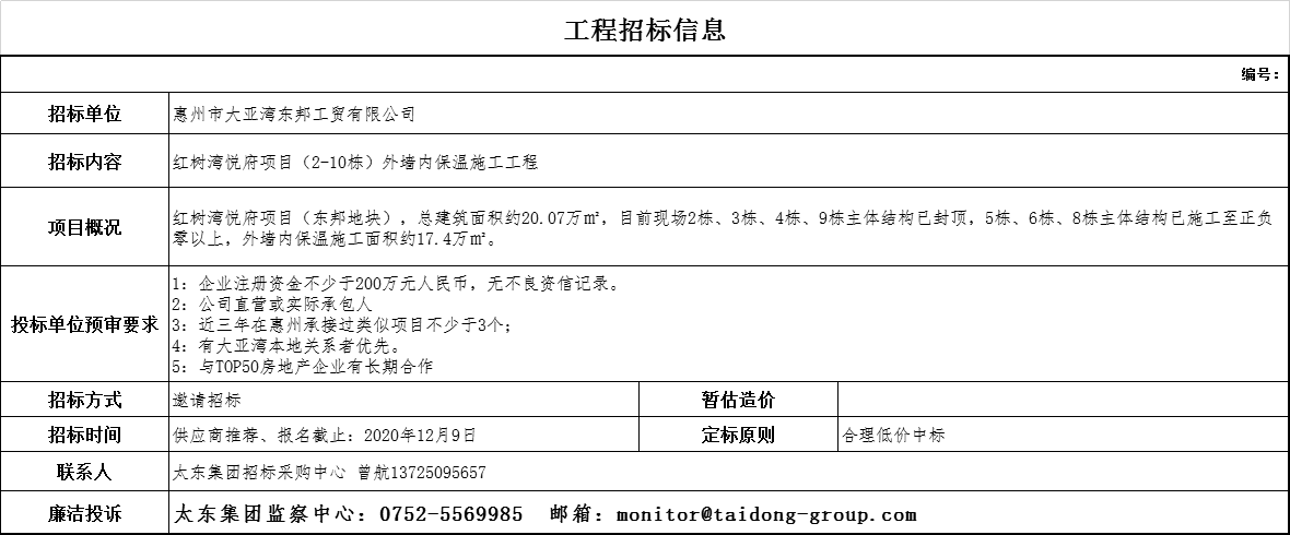 红树湾悦府项目(2-10栋)外墙内保温施工工程招标公告