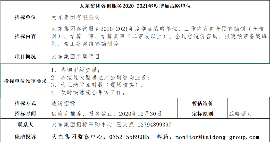 太东集团咨询服务2020-2021年度增加战略单位的招标公告