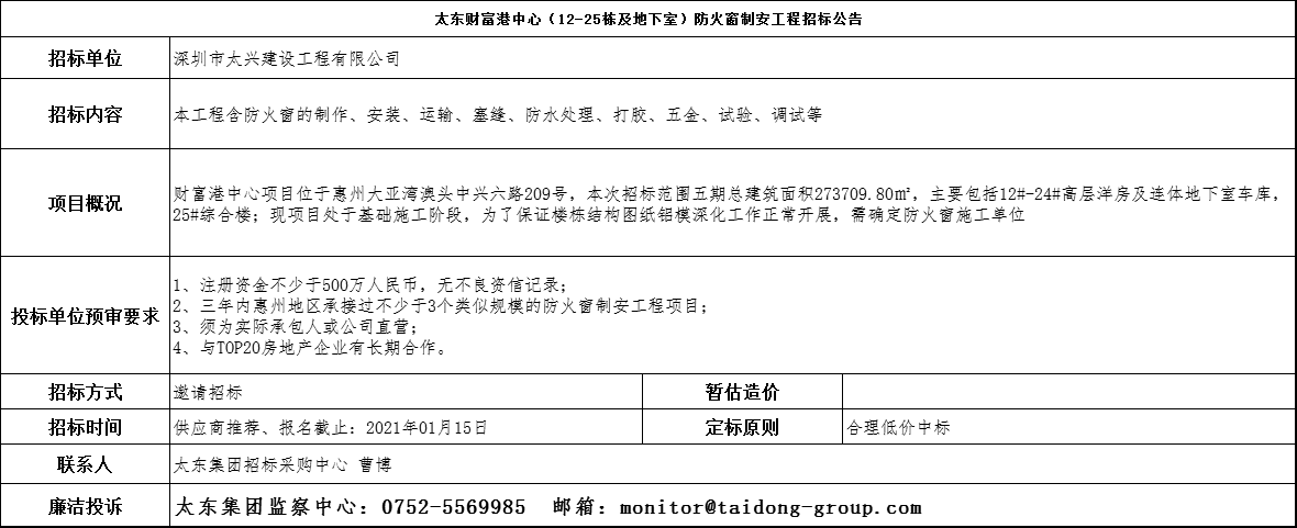 太东财富港中心(12-25栋及地下室)防火窗制安工程招标公告