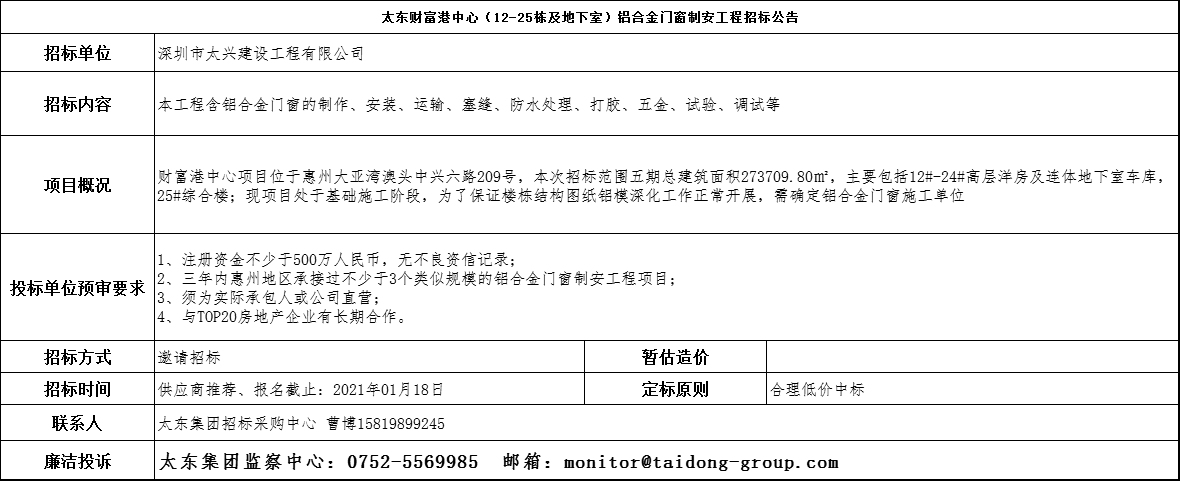 太东财富港中心(12-25栋及地下室)铝合金门窗制安工程招标公告