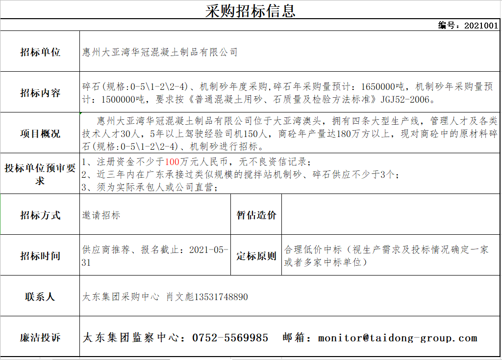 惠州大亚湾华冠混凝土制品有限公司碎石、机制砂年度采购招标公告