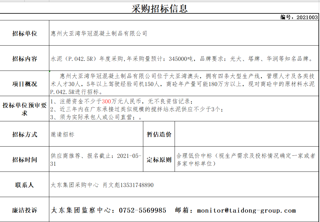 惠州大亚湾华冠混凝土制品有限公司水泥年度采购招标公告