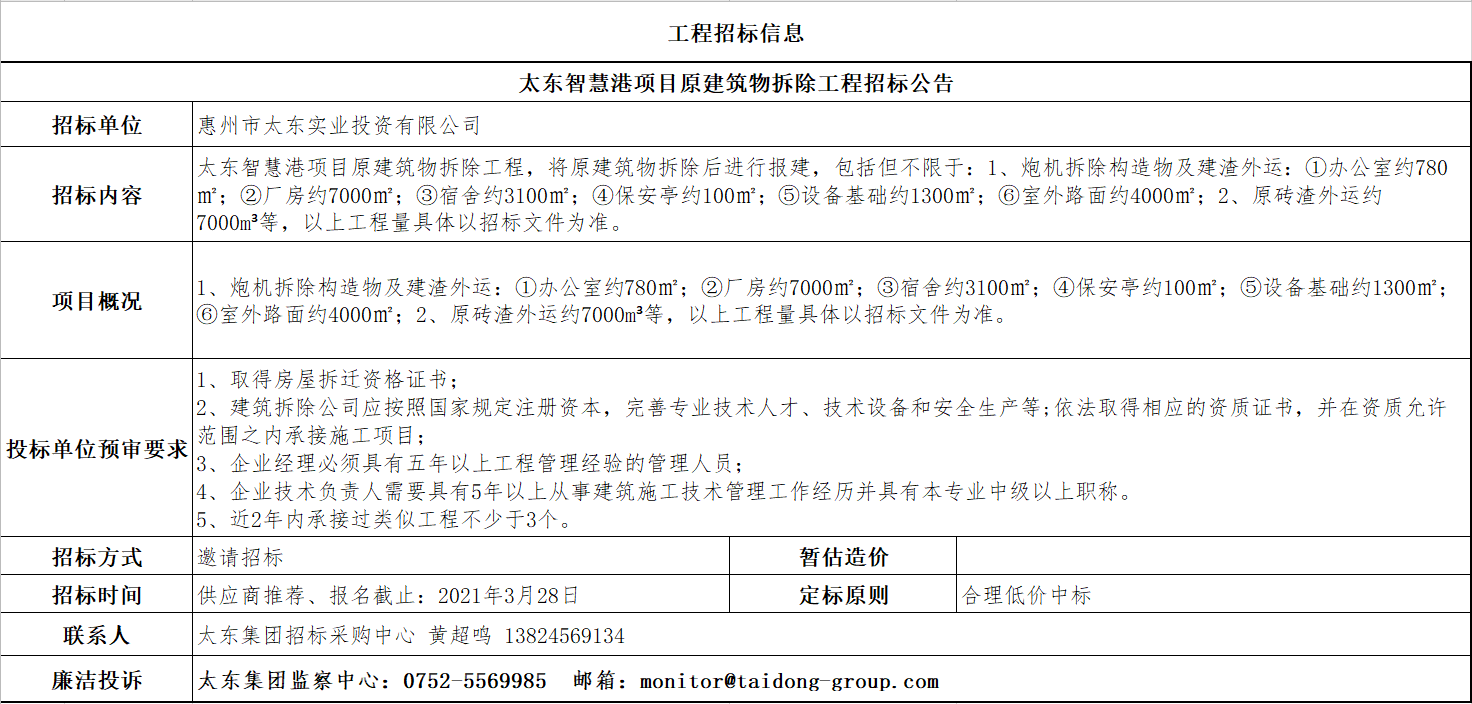 太东智慧港项目原建筑物拆除工程招标公告