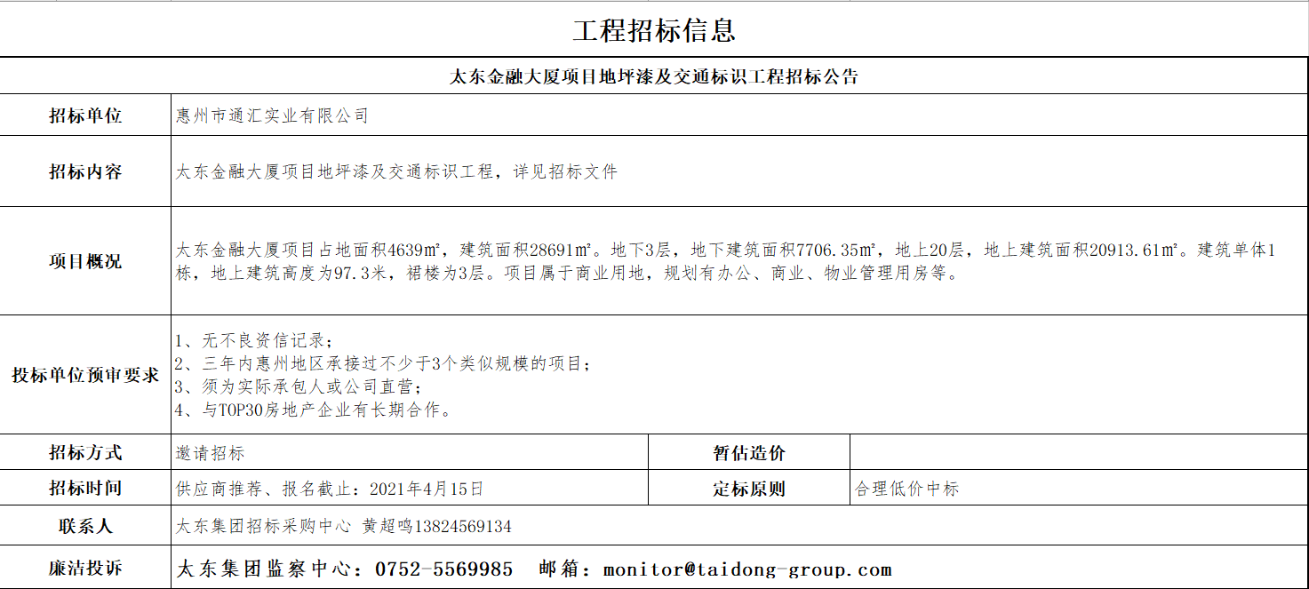 太东金融大厦项目地坪漆及交通标识工程招标公告