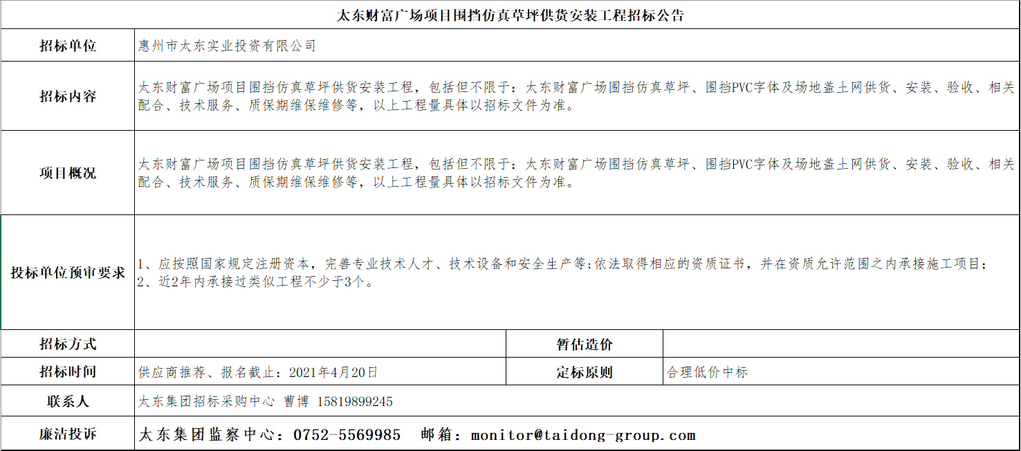 太东财富广场项目围挡仿真草坪供货安装工程招标公告