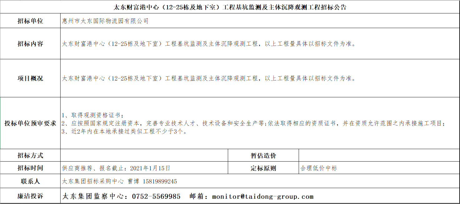 太东财富港中心(12-25栋及地下室)工程基坑监测及主体沉降观测工程招标公告