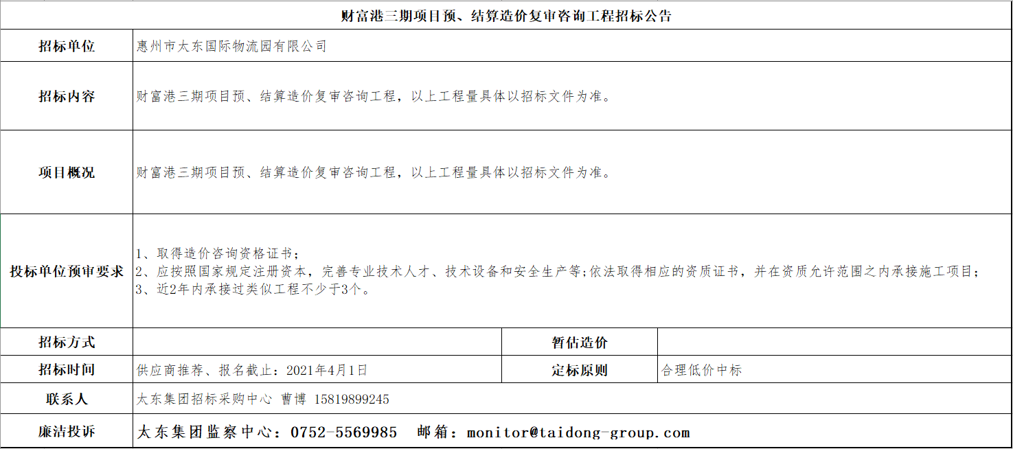 财富港三期项目预、结算造价复审咨询工程招标公告