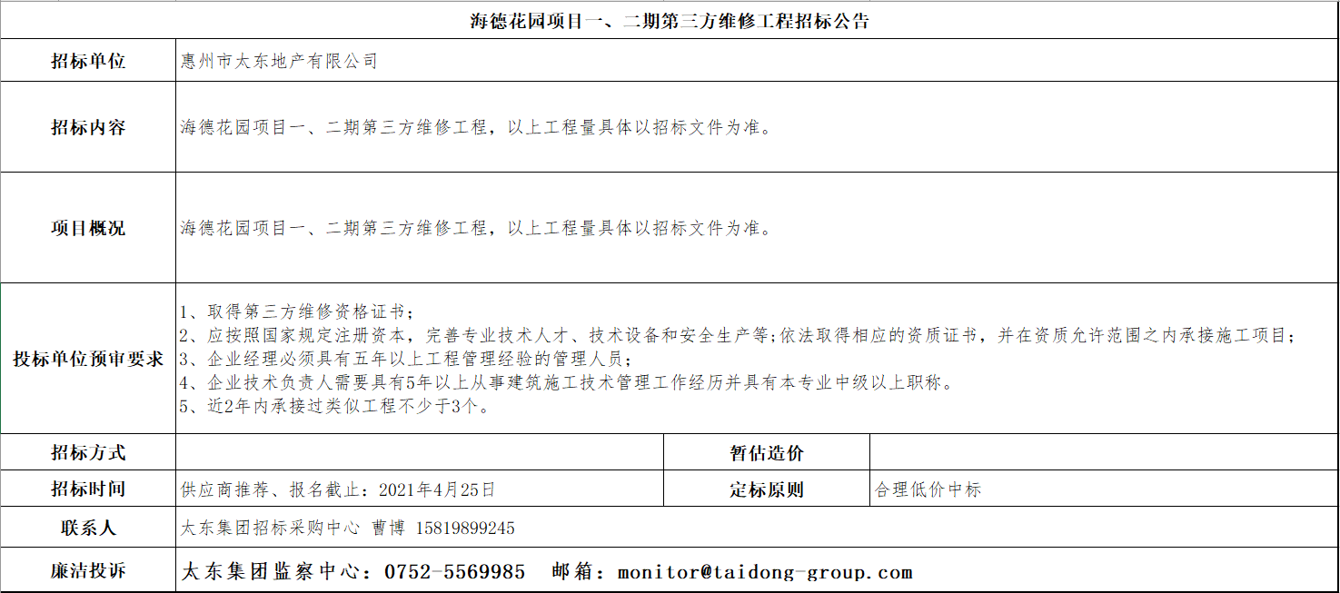 海德花园项目一、二期第三方维修工程招标公告