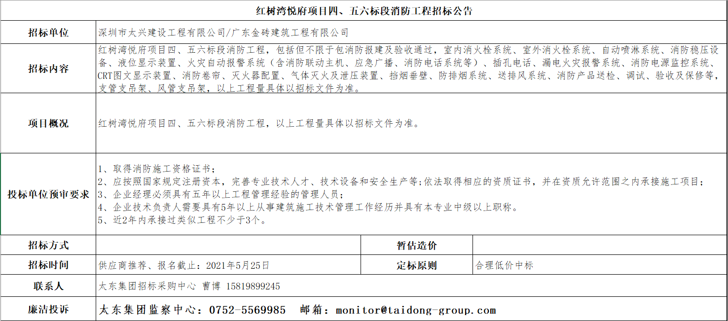 红树湾悦府项目四五六标段消防工程招标公告