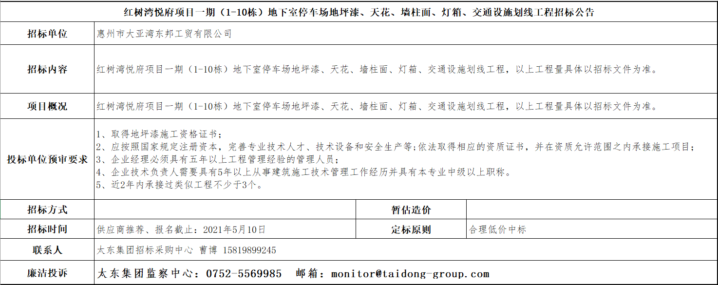 红树湾悦府项目一期(1-10栋)地下室停车场地坪漆、天花、墙柱面、灯箱、交通设施划线工程招标公告