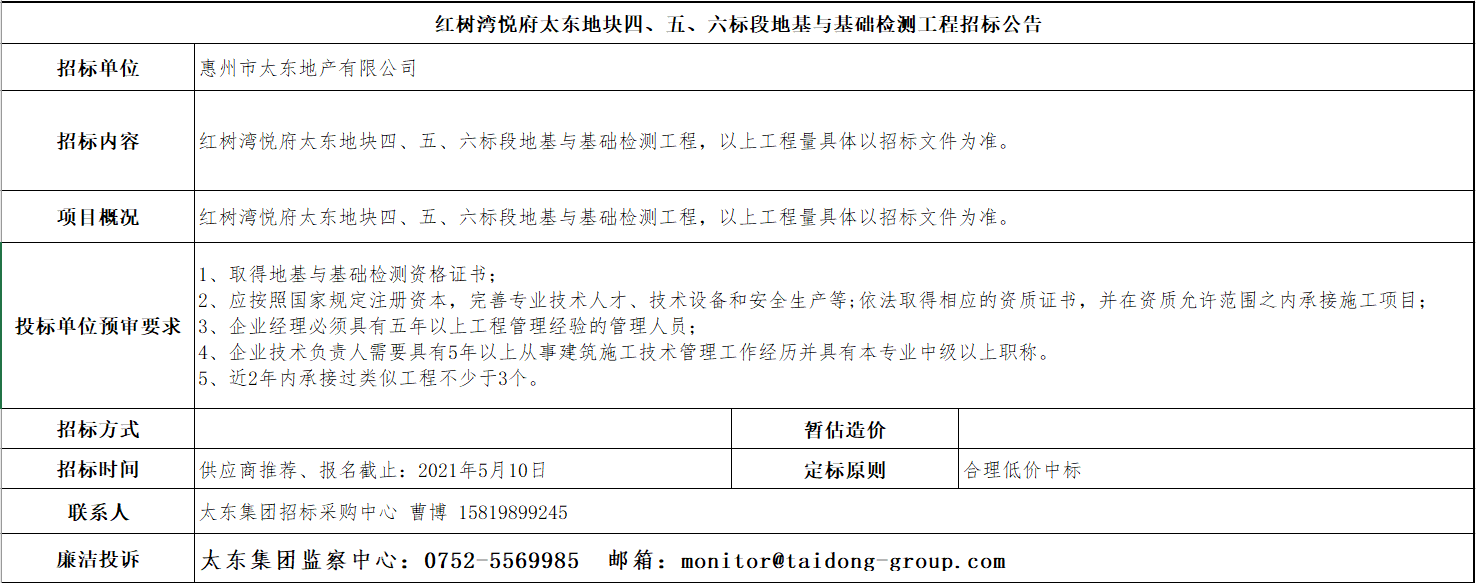红树湾悦府太东地块四、五、六标段地基与基础检测工程招标公告