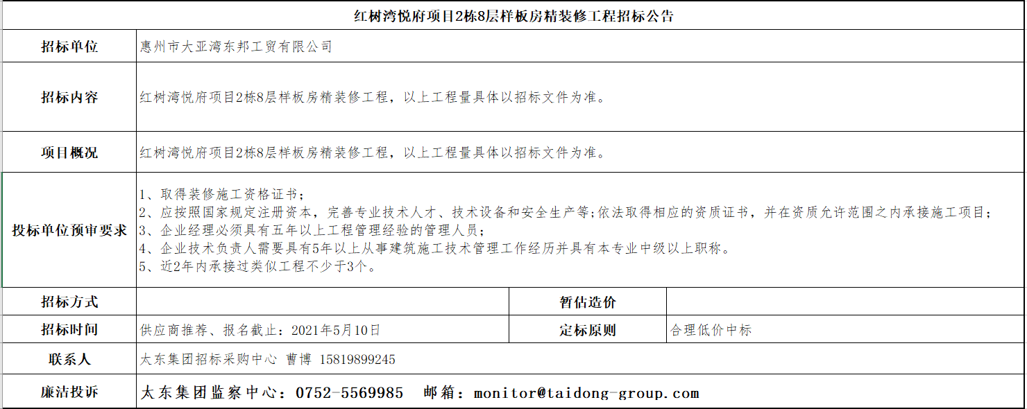 红树湾悦府项目2栋8层样板房精装修工程招标公告