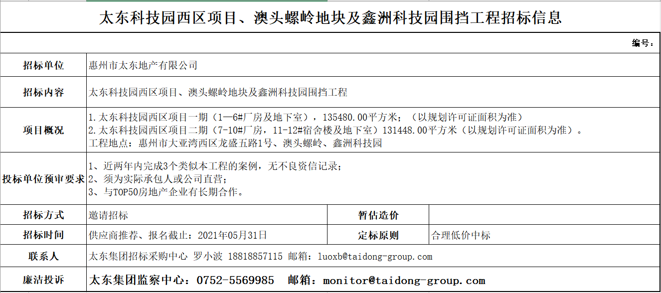 太东科技园西区项目、澳头螺岭地块及鑫洲科技园围挡工程招标信息