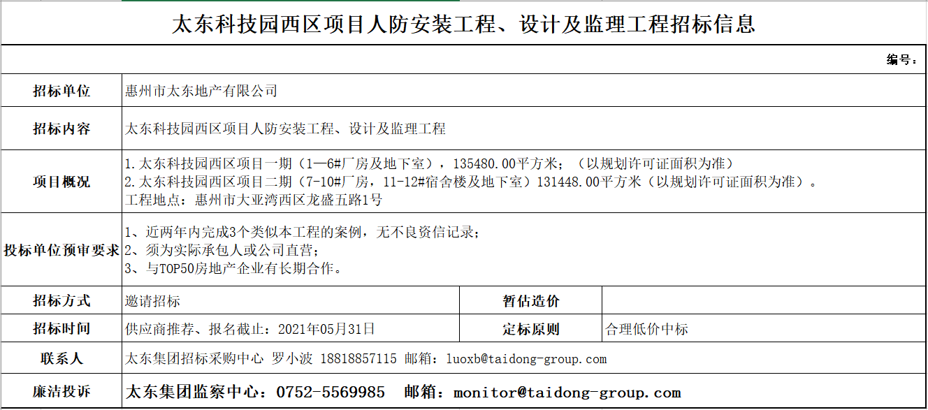 太东科技园西区项目人防安装工程、设计及监理工程招标信息