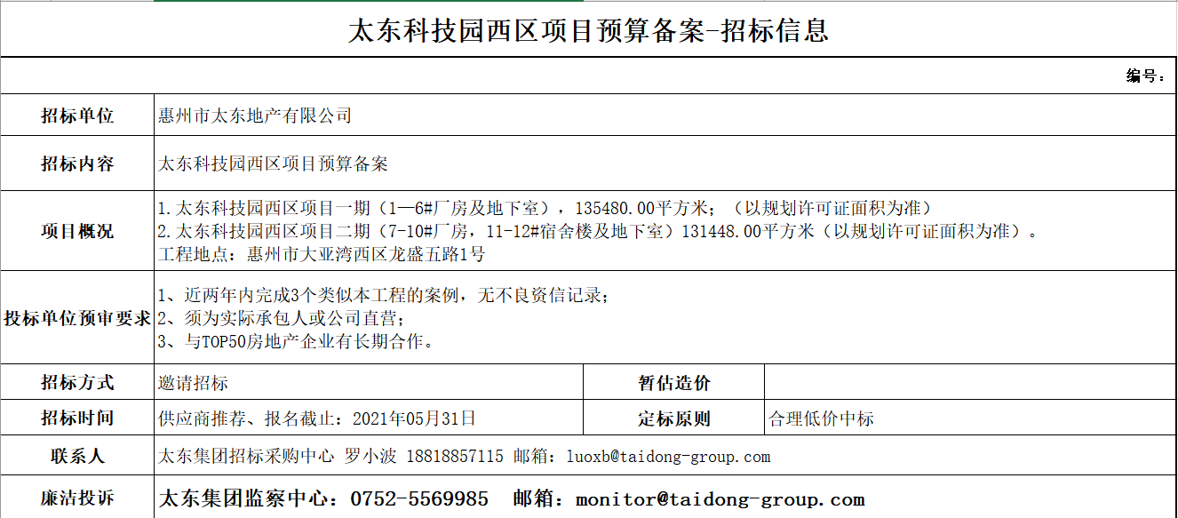 太东科技园西区项目预算备案招标信息