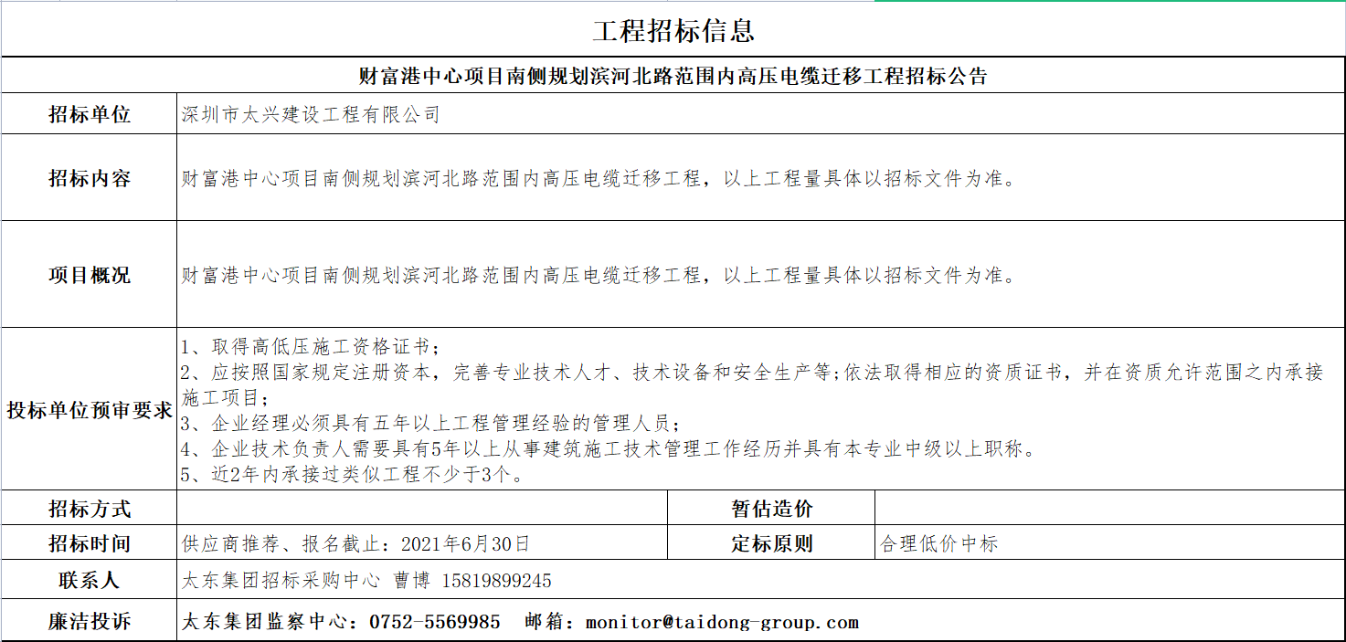 财富港中心项目南侧规划滨河北路范围内高压电缆迁移工程招标公告