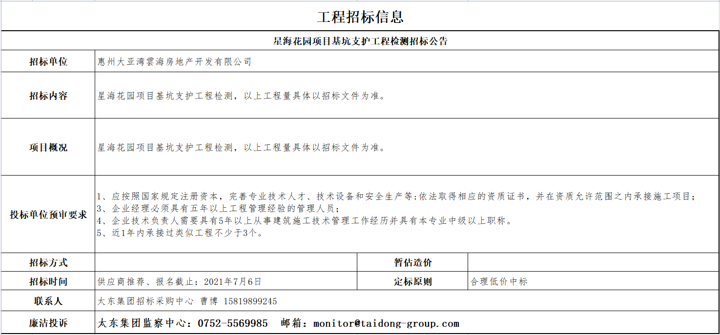 星海花园项目基坑支护工程检测招标公告