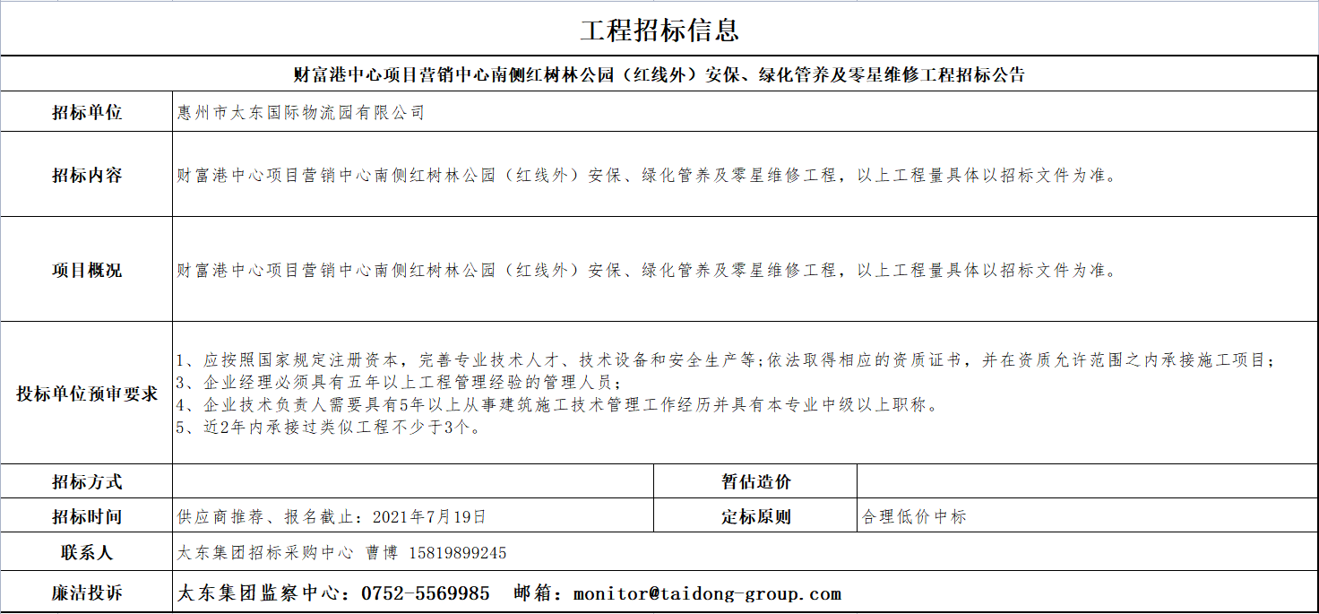 财富港中心项目营销中心南侧红树林公园(红线外)安保、绿化管养及零星维修工程招标公告