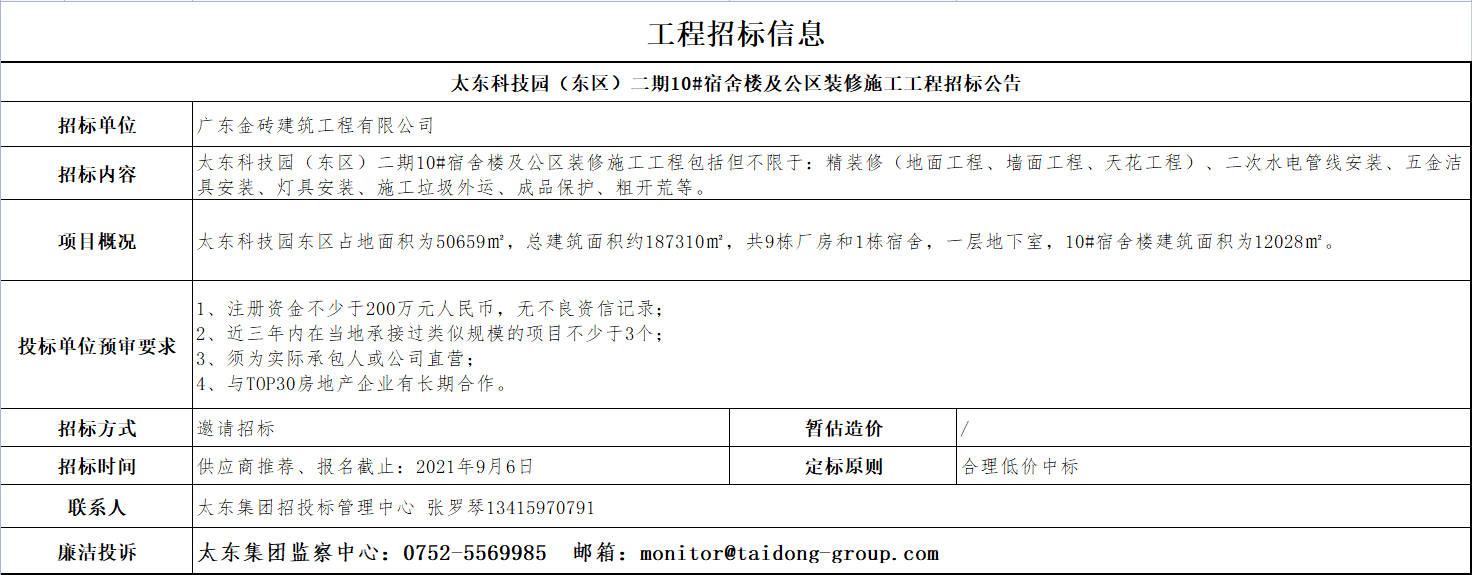 太东科技园(东区)二期10#宿舍楼及公区装修施工工程招标公告