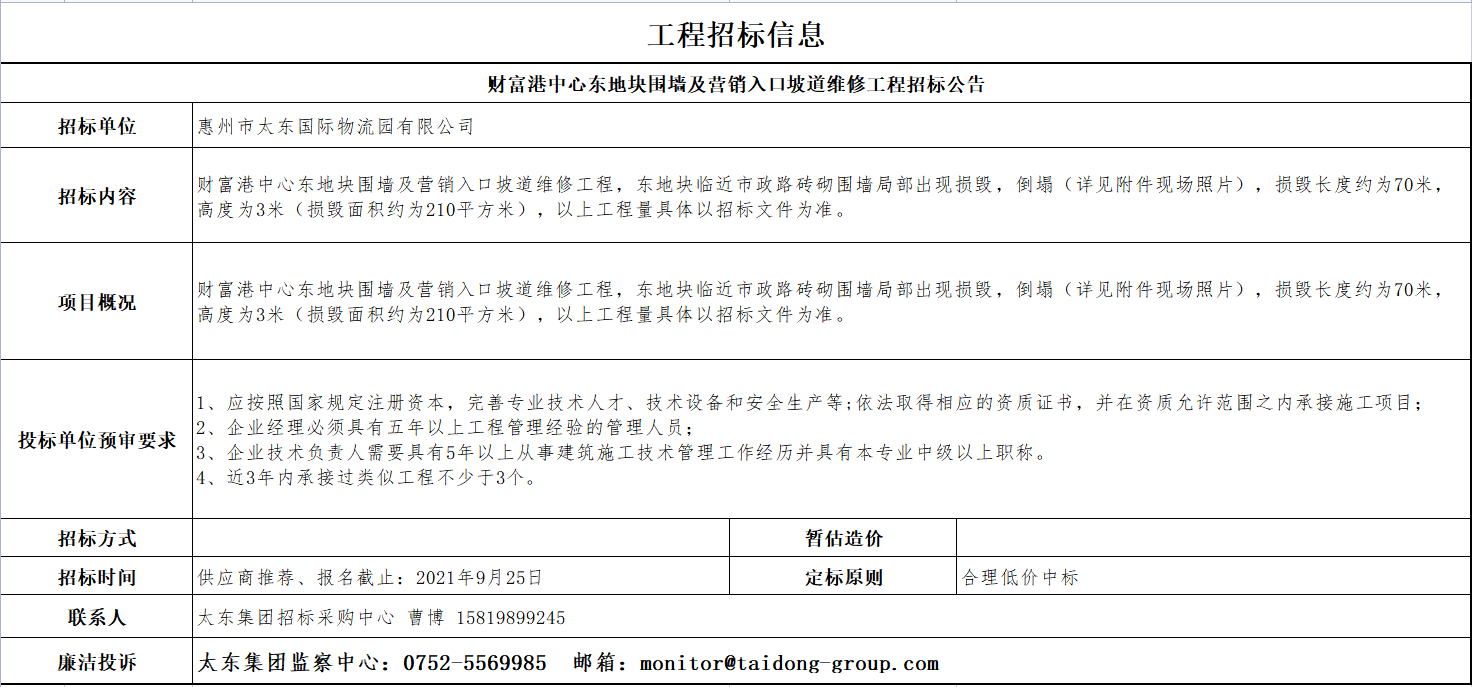 财富港中心东地块围墙及营销入口坡道维修工程招标公告
