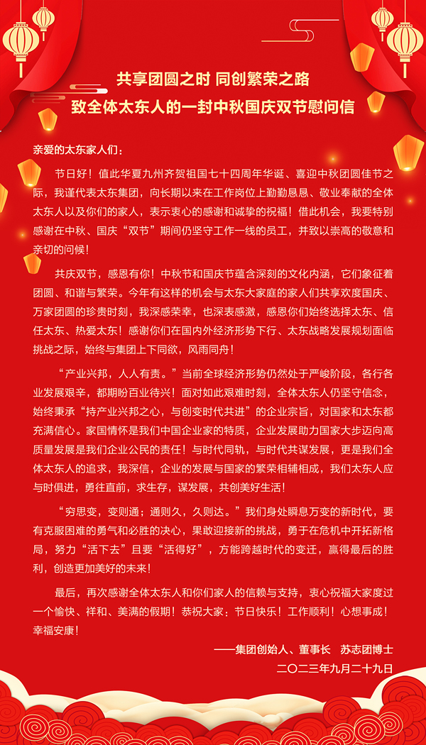 共享团圆之时 同创繁荣之路——致全体太东人的一封中秋国庆双节慰问信