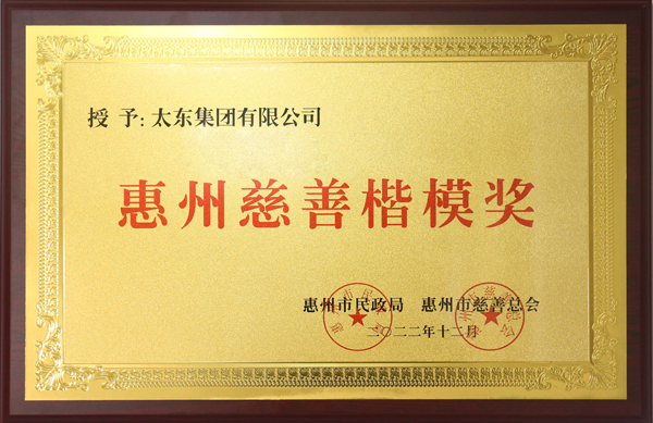 太东集团被授予“惠州慈善楷模奖”荣誉牌匾